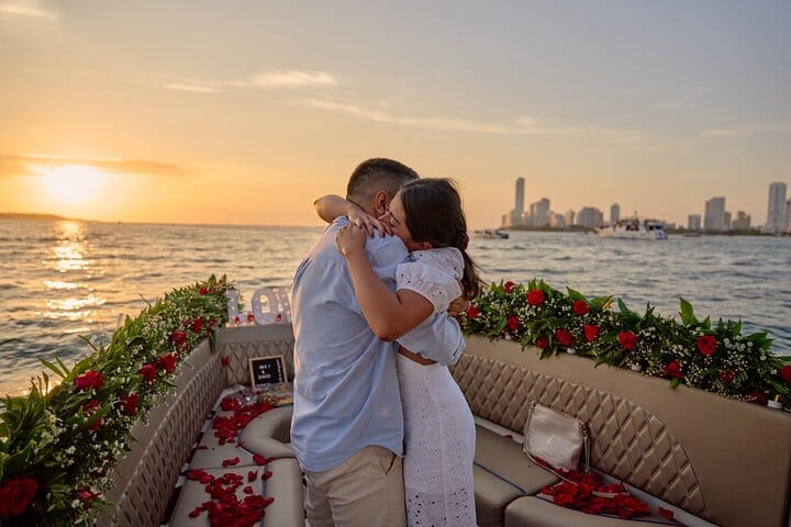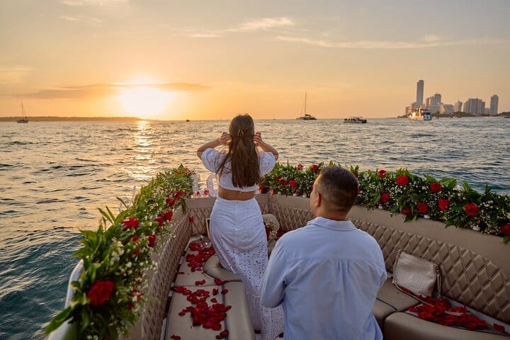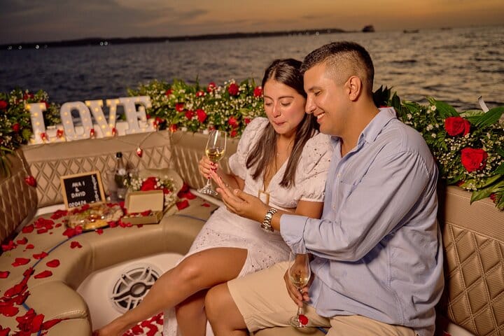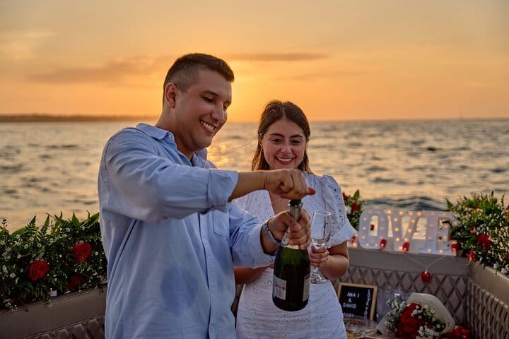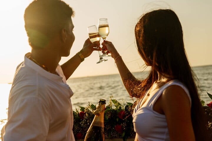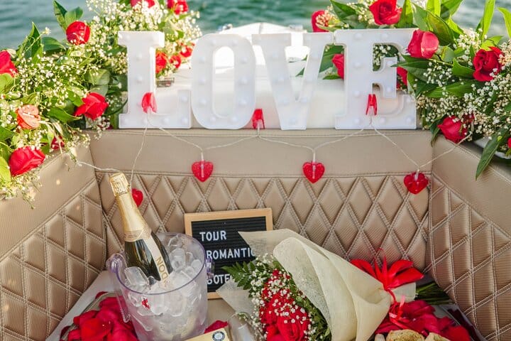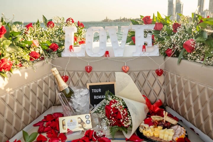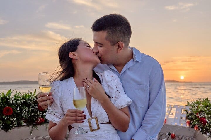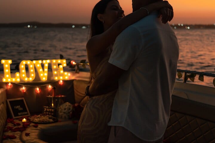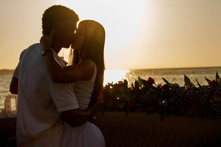 Enjoy a romantic tour aboard a private boat, sailing through the beautiful bay in an exclusive setting just for you and your loved one. During this intimate journey, you'll be greeted with fresh roses, a bottle of champagne, and delicious chocolates, setting the perfect scene for a memorable evening. As you sail, you can relax and admire the breathtaking views of the sunset, surrounded by the tranquility of the sea and the magic of the moment. A tour designed to make your experience truly special and unforgettable.
